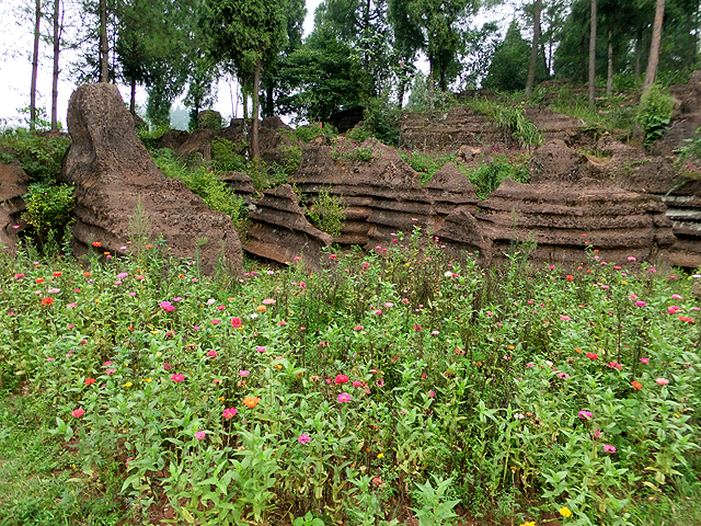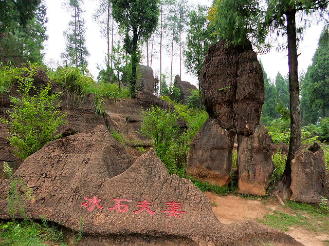 輕撫著岩身層層帶紋而行,丘坡又再次平緩成原,在這被命名為「花兒包」的地方,與長草野花和樂共生。一旁刻石書寫著神話,描述遠古之時孽龍為患,與岩土同化,造成風雨失調,土家人煎熬之際請得神諭,稱與其以鋤鎬屠滅藏山之龍,不如植樹養花斷其腰骨。於是一株油桐因而生立,並帶出遍野繁花,自此風調雨順。這以柔克剛之處也另有尊「冰石夫妻」,不知是一岩裂化為四,抑或四石疊依一起,底層二者還留些許間隙,但其上堆生之石卻似恩愛情侶貼臉熱吻,如糖蜜相融不願分離。
