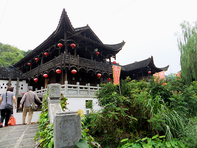 不過在荒山野原奔駛一早上,中午還是得覓些凡俗之味,看似空乏的鄉間,路旁竟冒出家餐館,小橋搭過溝渠,轉過矮灌木後是棟古舍。古舍墨黑樓板,建造時似亦花過心思,簷下繞廊以細木連拱而綴,間隔添上花燈。導遊說這兒僅是鄉野小菜請大家包涵,但卻意外有其風味。