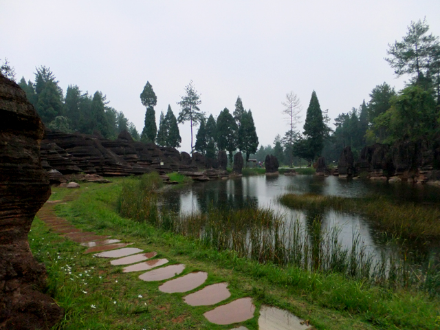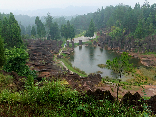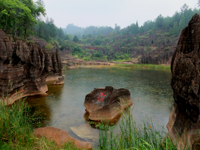 攜著綻出粉紅花朵的幸運,再往前繞幾個彎,這兒岩盤頂部裂分成柱,被封予「八部天神」之名,以威嚴姿態睥睨眼下岩林列兵如陣。然此時下望,「天池」形似月牙,指向被雨霧渲染成水墨的遠山,碧鬱水色添了銀空之清冽,裂岩線條也不再那麼剛冷,倒像巨獸群集伏首小憩,貪動幼獸於前擺尾舐水,漫著慵懶午後氛圍。我想紅石林最引人坐望之處便是這兒了吧,縱使細雨綿綿,卻虛緲得讓其多了詩意。
