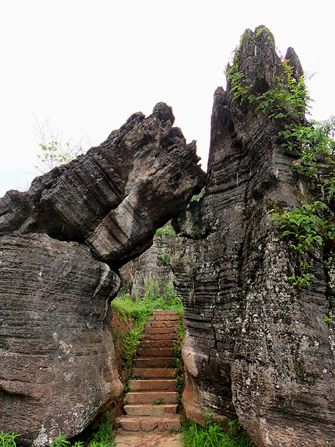 沿著池畔步道轉至對側,這兒小徑於岩間折拐而上,入口附近有座「幸運門」,兩側尖石因其一斷傾而跨徑接依成門拱。不過倒覺那是幅青澀初戀圖繪,憨厚少年一臉羞赧、目不斜視、正襟危坐,一旁則有人耐受不住曖昧,偷偷緩挪移近,而後靠倚對方肩頭。