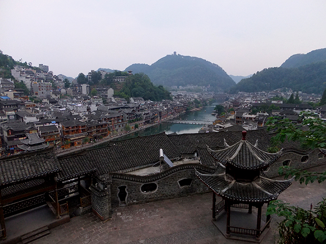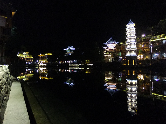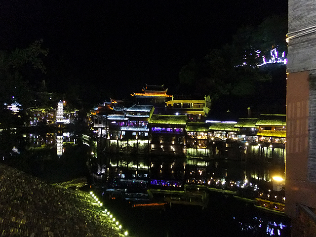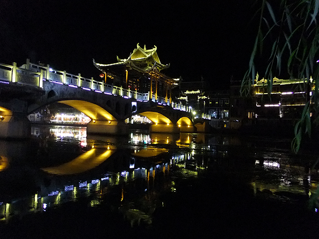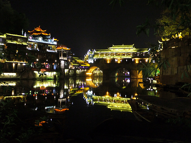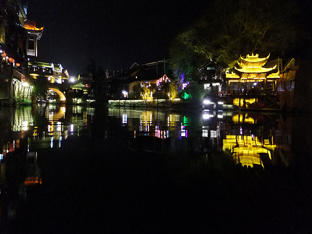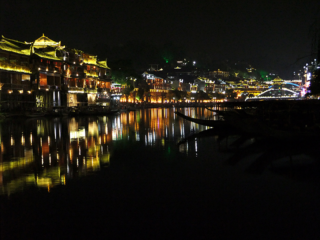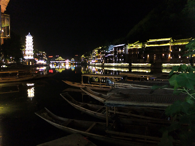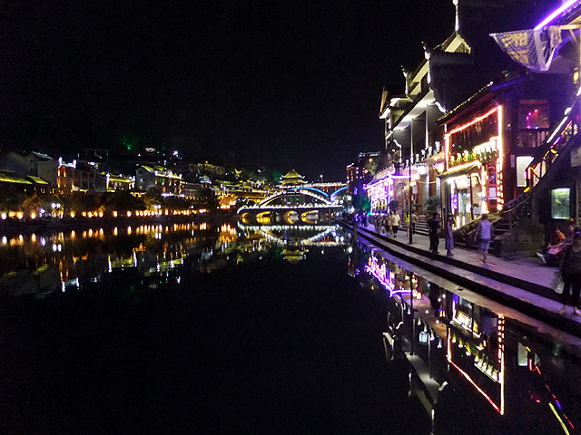 這瞬間我替古城感到悲傷,它應是純樸的、簡約的,而不是奮力抹上妖魔般彩妝只為多賺上幾分錢。想起前些年行過的烏鎮,河畔闃靜,廣場雖聚起夜生活,但傳來的是比較舒緩的輕音樂,木吉他撩撥,遊人們持杯而聆,不會過份擾了水鄉夜影。然再想想,或許鳳凰早年也曾持穩方寸,只是人世墮落之潮洶湧,便漸趨靡亂。而烏鎮,也不知這千餘日子過去,是否也已沉於泥濘,染上污色了。