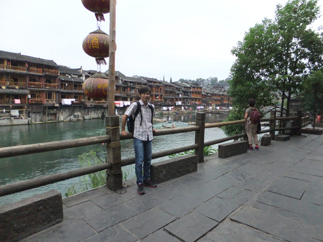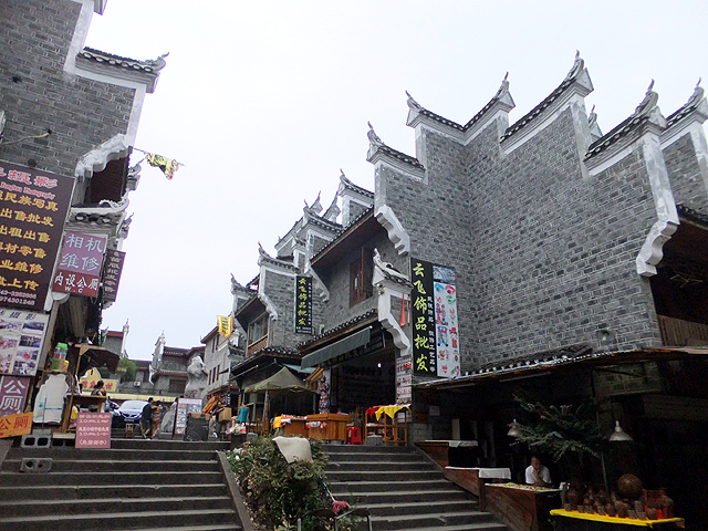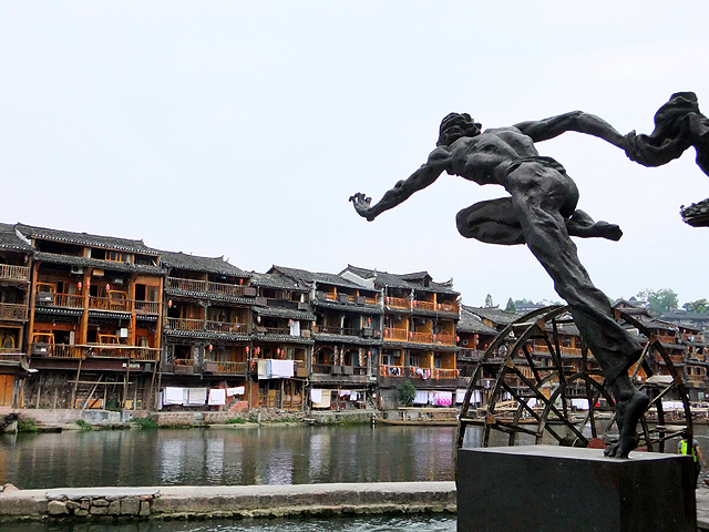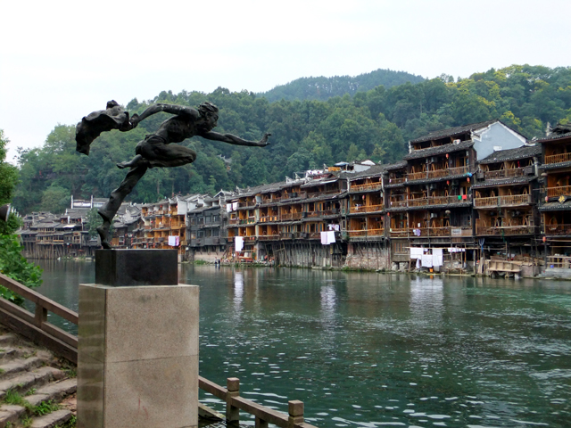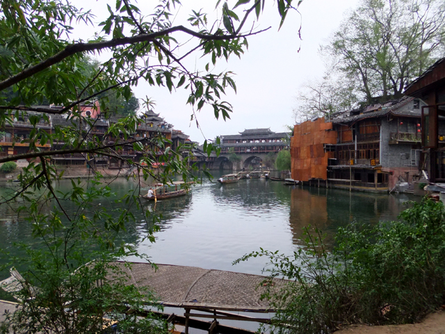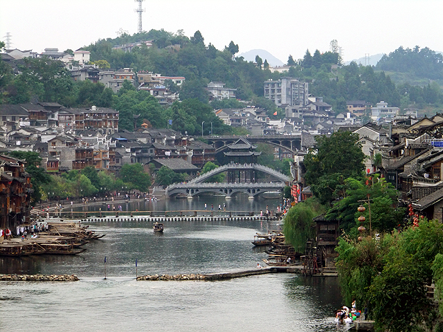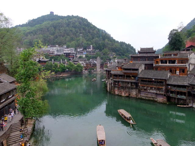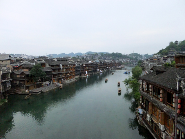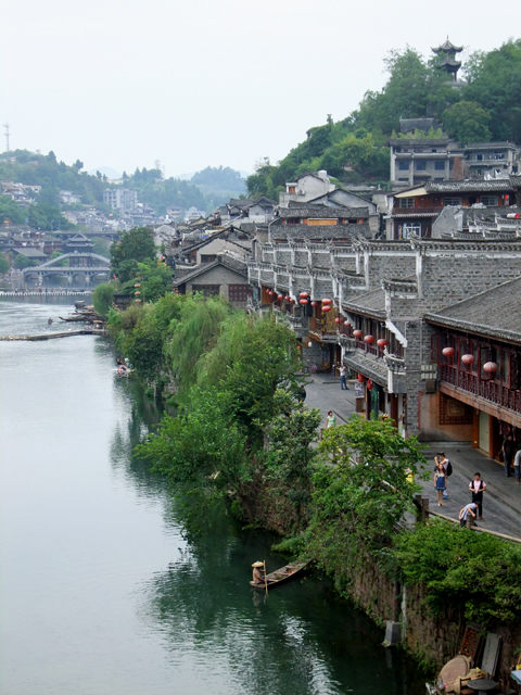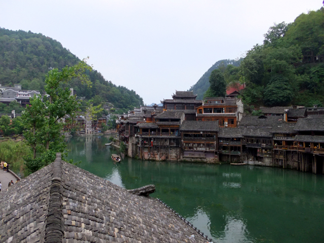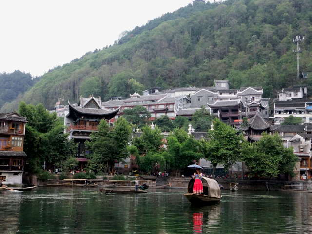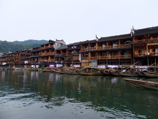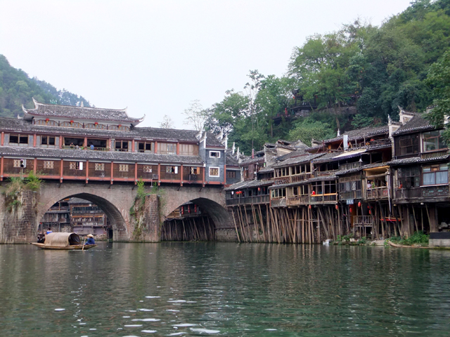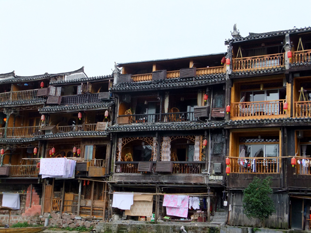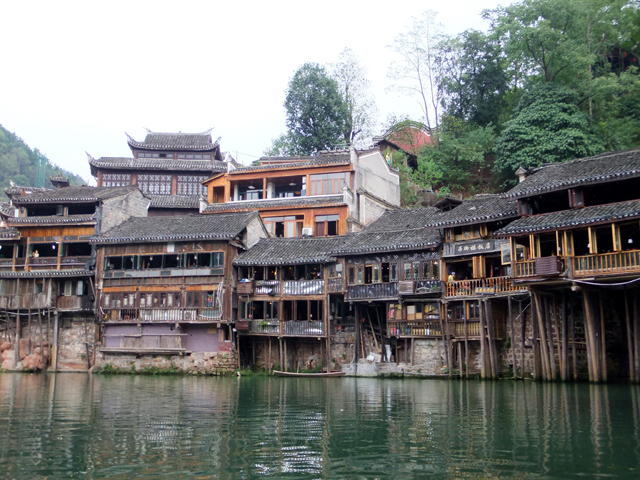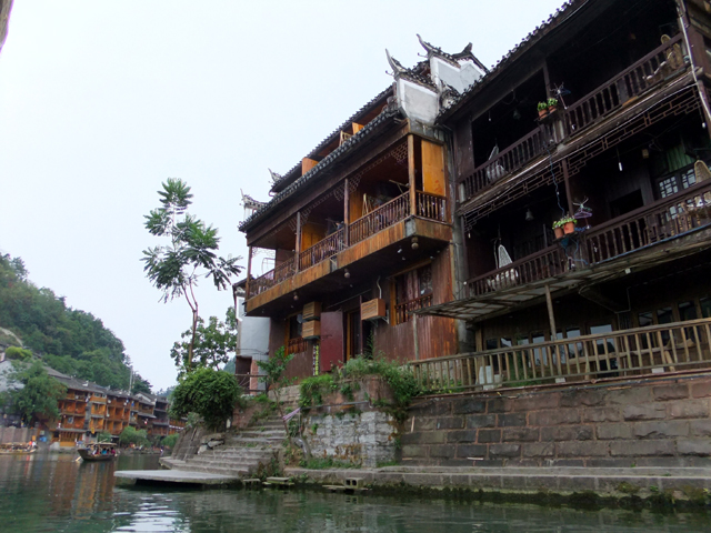 小舟僅容十人,撐架草蓆頂棚,可蔽暑擋雨,船家長篙撐抵,將我們送入流水。我微伏身,向外伸探頸首,將視野拓向江岸。渡口之外,城下臨江之處另蔓生一列屋舍,這便是當地著名的吊腳樓了。面街方向與一般建築無異,但後背凌空於水面,只用數根細柱支撐樓板。當依順水波一路望去,樓房高低錯置,撐柱交疊紛雜,看似零亂,卻有種隨興擺弄的美感。