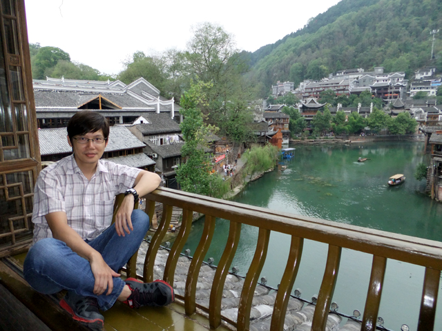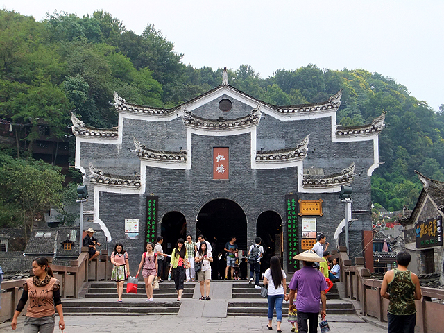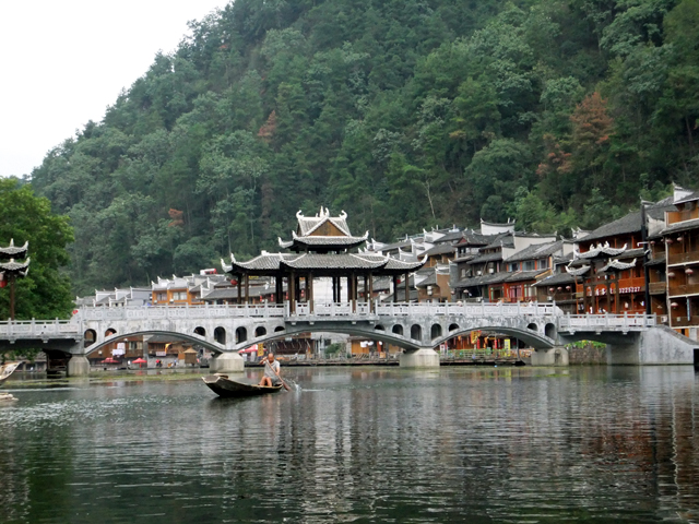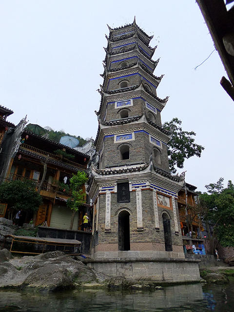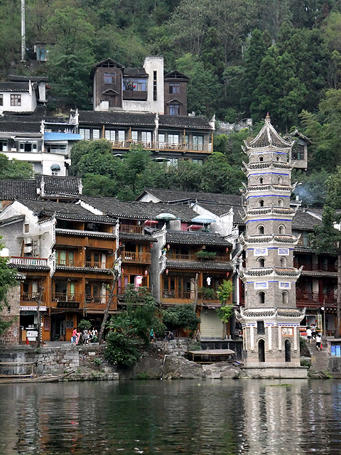 穿過橋眼後,江水打了個彎折,眼前景色更添重嶺之蒼翠,飛挑簷角、岸邊植林,或密或疏地在山河之間點抹著,還有艘從另方向轉來的小艇,土家族姑娘立於船頭,應景唱起嘹亮歌謠。河畔另可見一尖塔,六角七級,由下往上樓高漸次縮減,牆石以藍白雙色綴邊,在紛雜屋林中,依舊顯得醒目秀美。據說它前身作焚燒字紙之用,後毀於文革,近時又集多人之資重生,故現稱「萬名塔」。而輕舟至此也擺了個旋,緩緩靠岸。