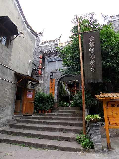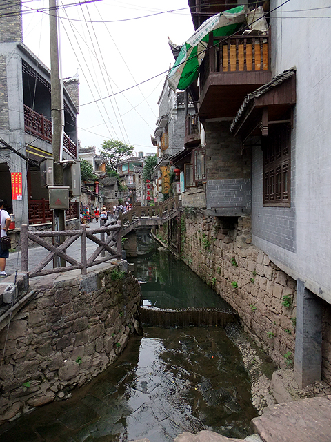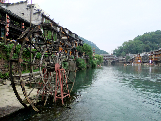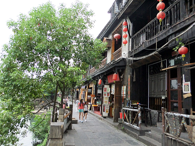 這麼怔怔望著,倒也不覺拖磨時間,閒坐許久才從另端下往對河岸。適才於跳岩處無暇多所探索,這會兒離午餐還有空餘,便隨興穿巷拐弄地前行。然此段或因坡嶺地勢所迫,佔幅不大,走著走著還是又踱回岸邊。此側店家退讓出一條堤道,剛好方便遊人賞望南面吊腳樓橫陳。隨意瞥過店家吊掛的燈籠與玻璃瓶陣後,不遠處現出小屋接延成渡口突兀探出,屋畔還伴著一座水車,襯上背側江樓顫影,很有水鄉氣息。