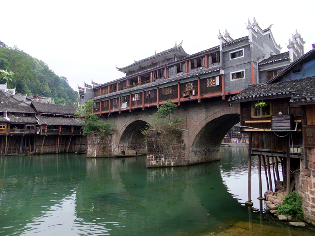隨江水前行,不遠處橋樓橫亙,它被稱作「虹橋」,想必取其橋拱三連如虹之意。其上建起串連兩岸的古式樓閣,能見簷下窗口已有人閒適遠眺。
