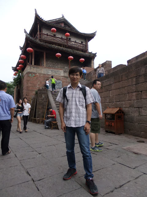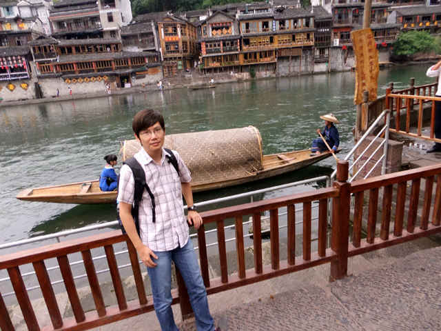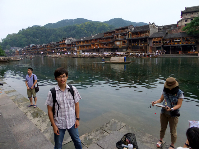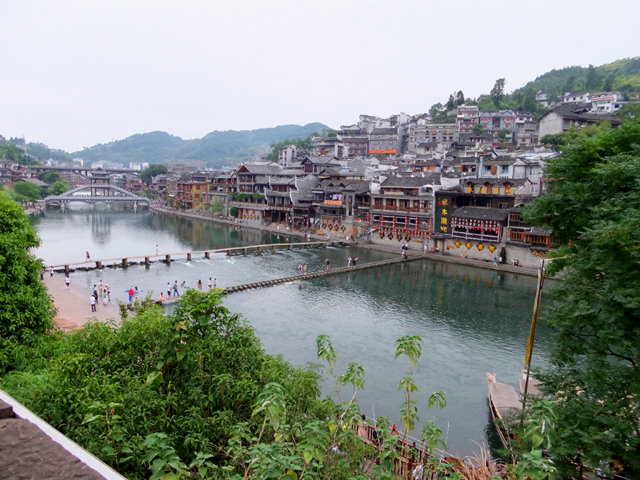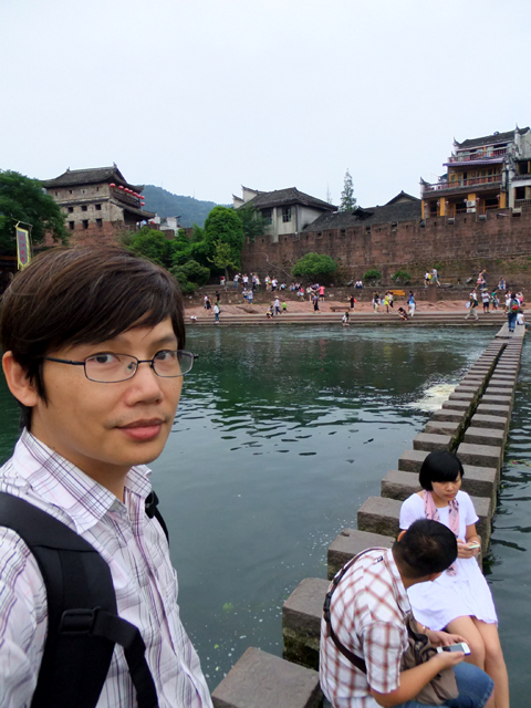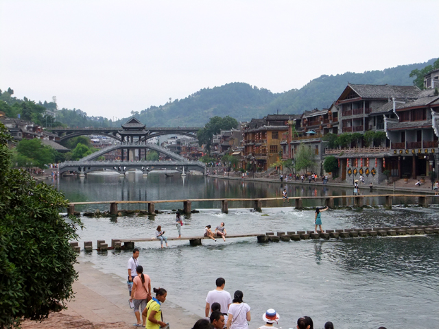 逛過城區內幾個標誌性歷史宅邸,我們又繞回北門,不過這次是穿過城門,貼近沱江江畔。遠處可見昨晚賞望夜景的大橋,之間為跨越長河、架高成閣的石拱,而近處還另有捷徑供遊人穿渡。一道是簡易木板、貼河搭接,另一則為有趣跳岩。間隔適當距離之石樁,看似有失足落水風險,但其實不需啥草上飛、一葦渡江的輕身功夫,只要膽大心細、落穩腳步,還是能愜意點踏而過。