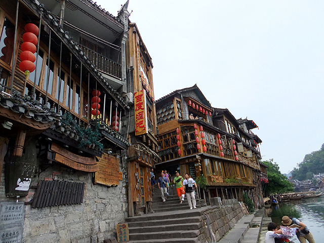 好在本人馬步夠穩,在等待空檔拍照之餘,還不忘眼觀四方,以柔勁化解觸身剛力,平安抵踏對岸。這側的建築看來因應觀光都改建為酒吧,成串的大紅燈籠高掛,但也無過分俗氣,襯著木作工藝的拼貼,很引人駐足端詳。