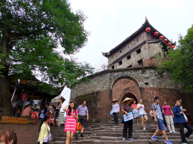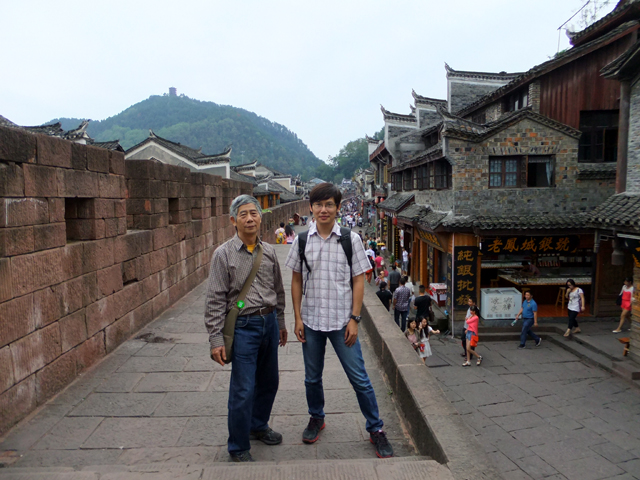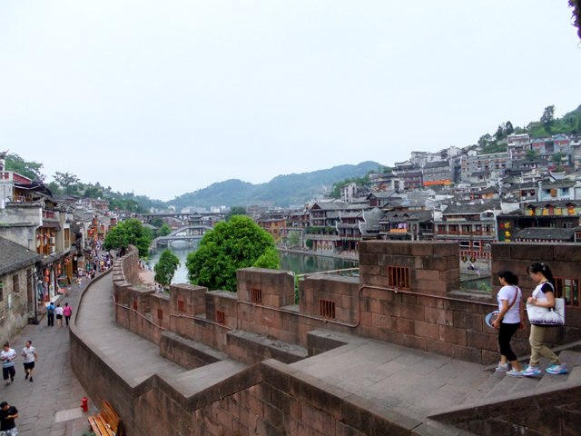 幾番彎拐,巷弄接上沿著城牆的環道,不遠處是古城北門,尖翹屋簷如飛髮,積著風霜,赭紅磚牆似盔袍,殘著傷痕。城牆不算高,我踏著矮階上去,牆旁另有架高戍衛步道,不少遊人在此閒踱,一邊是城區排列緊密的商家,另一側,透過垛口,便是江岸景致秀麗開展。