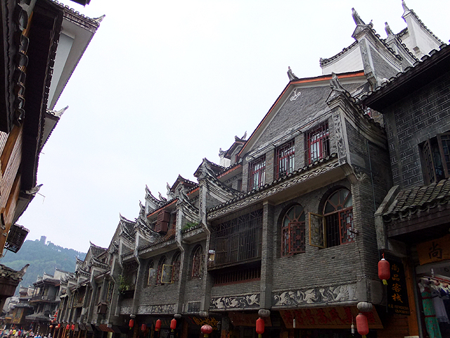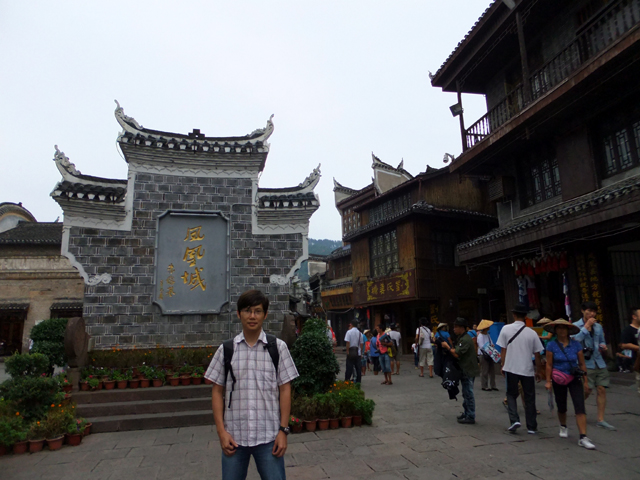 嚐著領隊推薦商家出產的薑糖,往前深入,紛雜的巷弄叉口又有個小廣場,當中豎立帶簷單牆,嵌上「鳳凰城」字樣。這麼一個地標,又是遊人必定駐足、不停按響快門之處。耐著性子等待眼前清爽至適合取景的當口,一陣鼓譟響起,伴隨著的,是細碎的環珮輕擊連串傳來。轉頭望去,兩位華裝苗家少女婀娜移步行近。彩袍外,銀色項環複雜垂掛層疊飾墜,帽身精鑲著花葉,然後化作月牙指天。