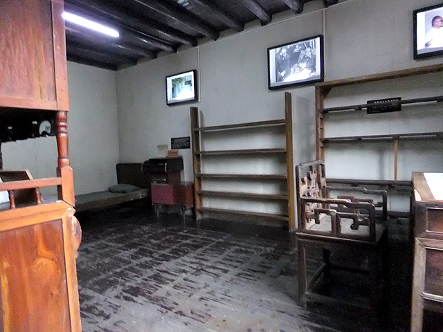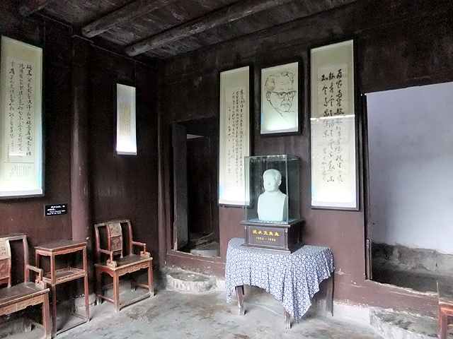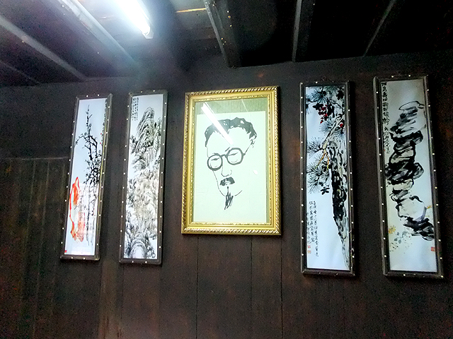 不過由於他非大戶人家,故屋內倒也沒啥令人驚艷的雕琢,主廳灰撲撲石泥地上有簡樸細木桌几,牆板懸掛其人之素描勾邊,以及數幅飄逸草書。往內轉去,或許是當年書房的小室只存空寂書架,其上由後人點綴黑白照,記印沈先生高齡時之樣貌,臥房倒還有座支架頂欄稍作雕鏤的睡床。不知是否真長年清苦若此,若是,或許正由這份清苦,將其字裡行間添上更貼近人心之感觸。
