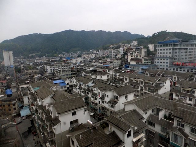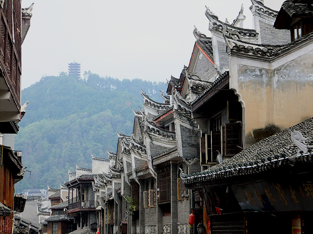 行了遙遠大段路返回旅店,盥洗、倒床,再睜眼時,窗外已轉為淡灰街景,鳳凰古城外圍的房舍素牆墨瓦,堆疊得緊密。領隊帶著大夥,從我昨晚半途行過卻沒踏入的巷口轉進。當時夜色昏暗,這會兒才知一旁是縣政府樓閣整路串至末端的政府賓館。站定望了望,不遠處還有小亭,背後是道坡徑,風雅地以帶簷迴廊攀繞,雖古舊失修些,但很別致。