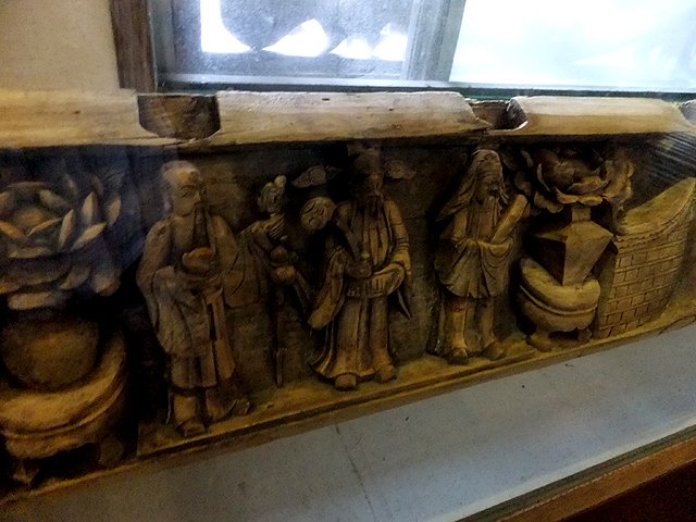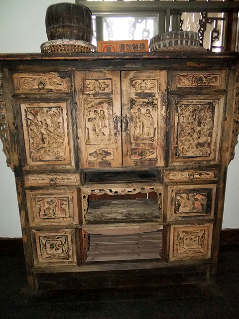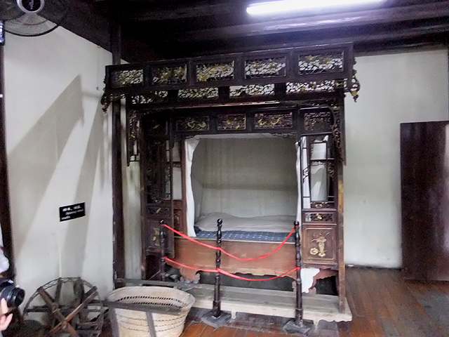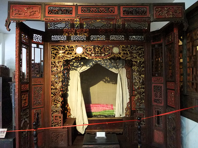 而這棟樓閣內裡改建成小博物館,展示老祖宗在建築藝術上的結晶,飾板鳳舞、雕柱龍蟠、橫楣深刻出福祿壽三仙。再往內還有雖已褪色、但仍可見細緻人物敘事的老櫥櫃,以及幾張框板鏤刻細膩、以金漆貴氣點描之臥床。