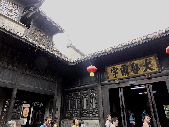 另一邊是兩三層高的複合建築,稱作「聽雨樓」。樓體砌石堆疊極富層次,襯上弧頂、角簷,便勾出山稜林梢。一道附牆雕欄木梯,宛若攀崖棧道領遊人登高眺看。我爬了上去,外廊曲曲折折在對面外探成一座戲台,頂上的山形楣以蝙蝠咬含錢幣凝聚視覺,也代表福氣與財富。據說眼前這些木造構體都運用巧妙工法搭接,不用一根釘子。