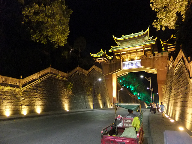 隨道路往北,兩側地勢隆起成丘,少了些商家也少了些喧囂,走了好一陣,一座古式城樓「南華門」橫架路頭,飛揚簷頂、串著耀光,一股念頭竄生,登高想必風光好,然走了這般長路的我犯著懶,這念頭很快飄過,腳步還是自動往河岸挪移。而穿過門樓沒多久,便見眼前輝華點點,繁麗的沱江早已點了朱唇,貼上翠鈿,拋舞著水袖,媚眼展現身姿。
