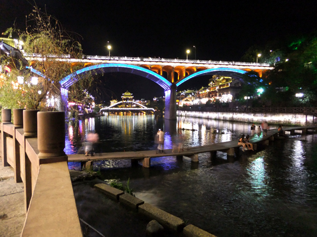 前次的黃山行,烏鎮夜晚溪聲輕緩、橋拱圈連,其水鄉氛圍令我迷醉,故這回說什麼也要來重拾當時感動。然鳳凰距離長沙又比張家界偏遠些,驅車輾轉怎樣也要四五小時,旅程中的半天就被迫於顛簸中度過。多數行程為安撫旅客不耐,會於常德用餐放風,順道也看看那兒景點。不過先時瀏覽網頁,柳葉湖景平淡灰緲、沿堤詩牆稍嫌做作,望來都不怎麼吸引人,於是便把那些選擇刪去,多留些時間予張家界,全程龜在車裡便龜吧,吾以一「忍」字貫之。