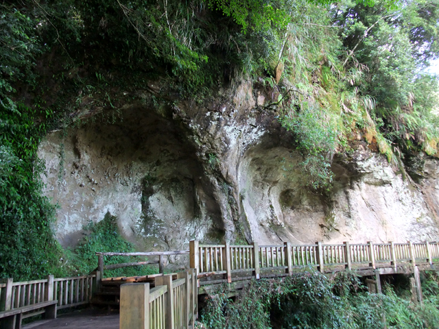 瀑布附近的景觀很特別,有片凹陷進去的空廣崖壁,步道彎彎曲曲地攀了進去,