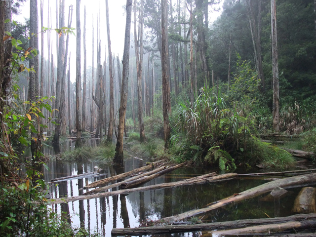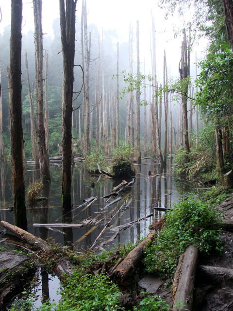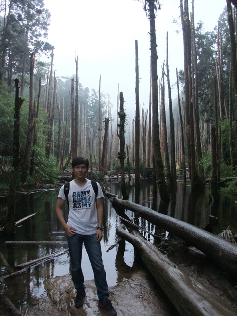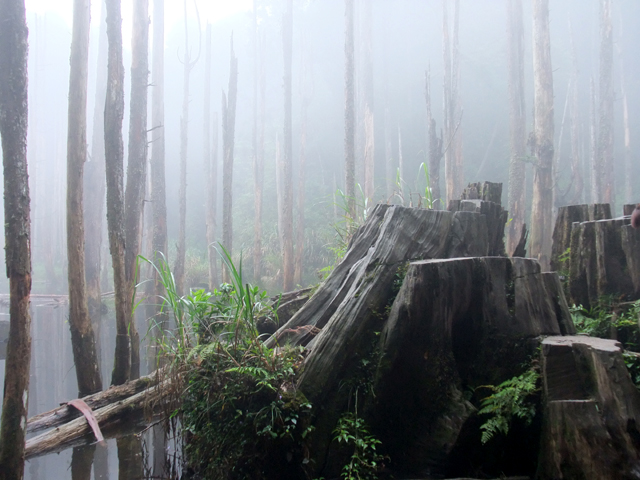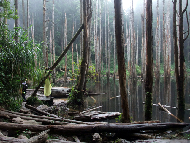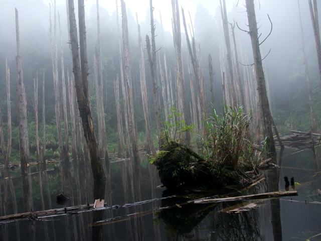 那是一片因颱風侵襲而形成的小湖,本長於此的樹木被水浸泡得壞死只存枯幹,