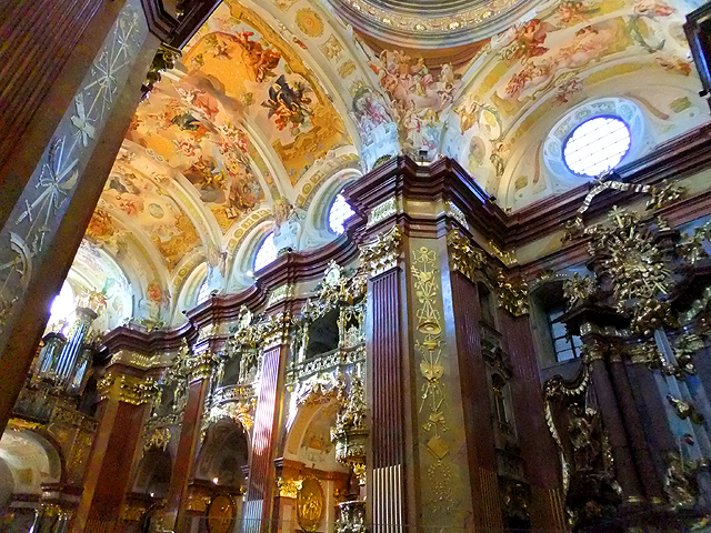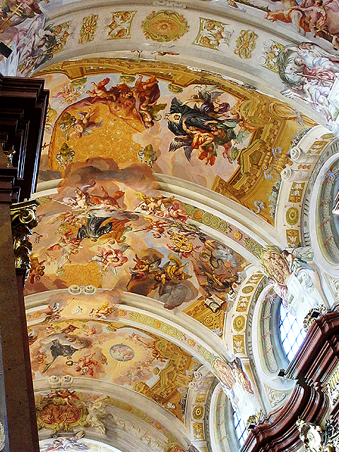 我由此抬首往上,天篷是用色相對輕盈的壁畫,以聖本篤(St. Benedict)飛升的場景為中心,拱弧狀的框架化作一個個天窗,往那兒窺看,騰雲間上演的便是美德與內心惡魔的交戰。但觀戰的天使們又彷若不甘寂寞,自章節裡飄遊而出,在柱框上飛繞。這份綿密織連的繽紛延續至拱頂,雲端高柱於此延伸著、聚合著,闢築出祥樂天堂。