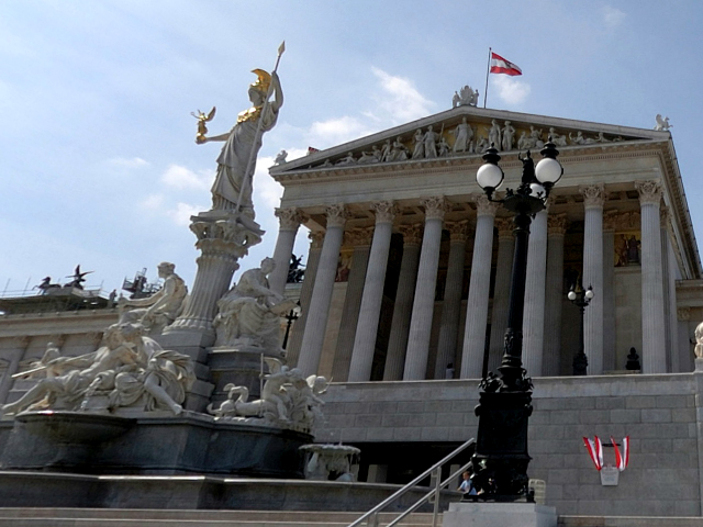 接續,是走近曾於霍夫堡遠遠望見、有著纖細參差尖塔的市政廳,以及隔著馬路與其相對的城堡劇院(Burg Theater),揣想圓弧立面裡上演的悲喜故事。此外,不遠處還有代表公正的綴金雅典娜,由象徵奧地利四大河的塑像護持,在那兒,國會大樓正展現希臘神廟式的無比壯闊。