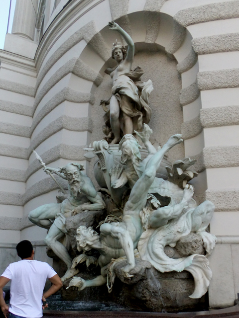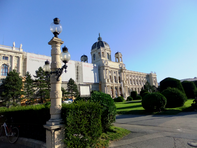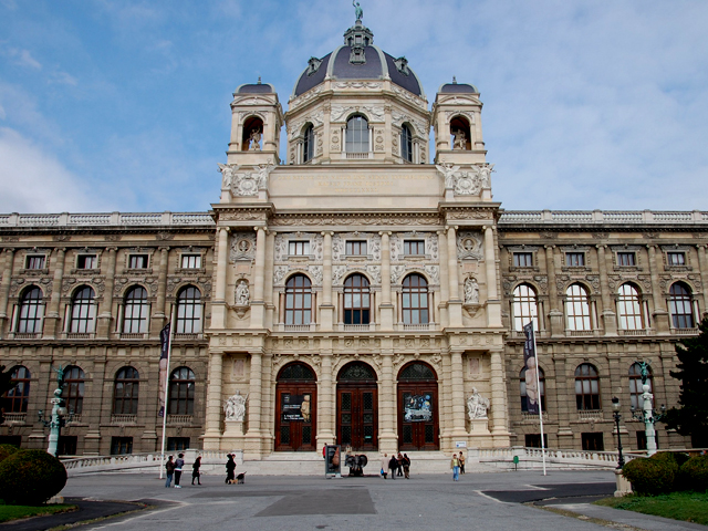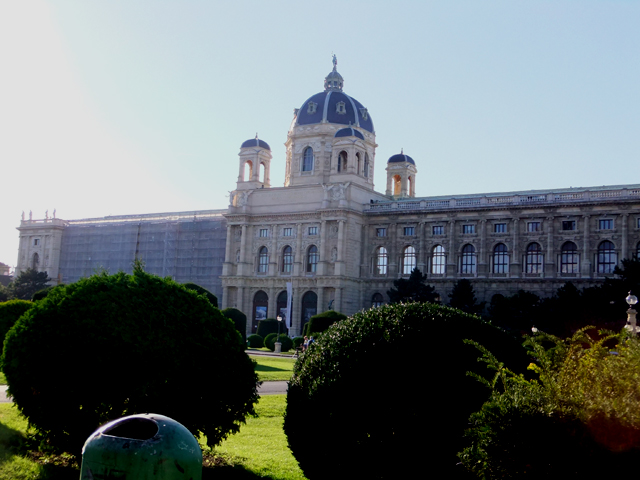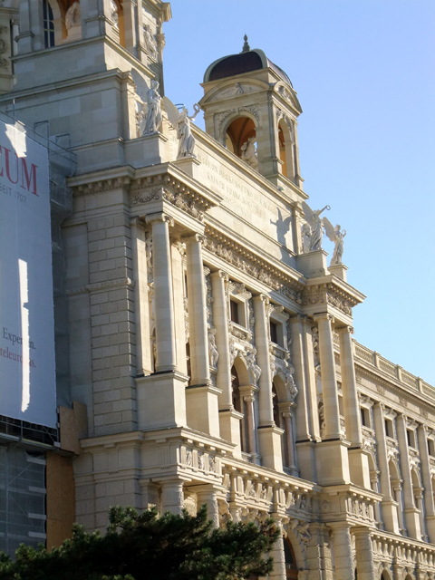 車往北行,進入城心精華地帶,原先這兒有著舊城牆,拆除後便規劃作環城大道,並於街側築立各樣古典建物,教堂、博物館、政府機關雕琢如珠鑽,將大道華美地串了起來。我們在中段的博物館區下車,廣場兩端各有一座宛若雙生子的建築,可見整齊長列窗臺及環聚的大小拱頂。北側是自然史博物館,南側為藝術史博物館,容易分辨的該只有拱頂上雕像,前者以高舉火炬的裸身男子為飾,後者的則似雅典娜,戴著戰盔手持勝利女神。