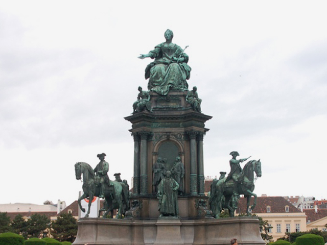 廣場正中有座銅雕,文臣武將環繞,其上威儀萬千的端坐女子便是瑪麗亞‧泰瑞莎(Maria Theresia)。哈布斯堡王朝傳至其父親這代沒有男性後裔,就由她繼承奧地利、匈牙利及波西米亞的王位,儘管礙於傳統,是丈夫洛林公爵接任神聖羅馬帝國皇帝,但她依舊為實質統治者,這位開明的女政治家將王朝國力又推向另一個巔峰,也為後來的政經制度定下基礎,此外,由於她子孫眾多,聯姻各國,有人戲稱她是歐洲的丈母娘。