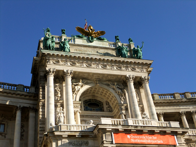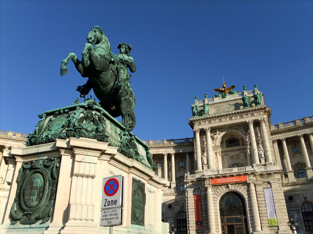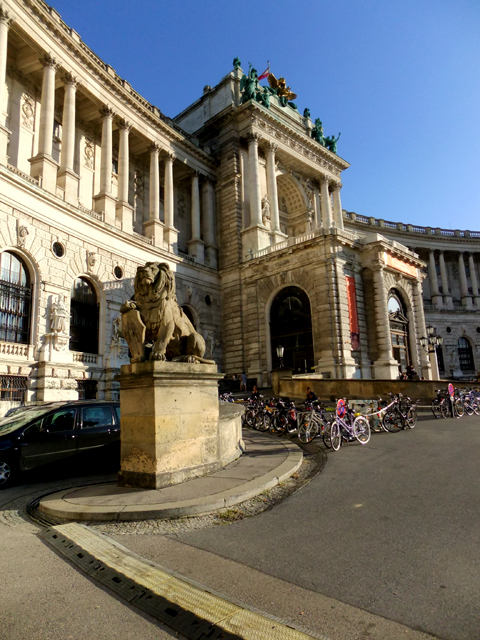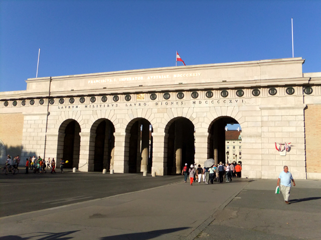 隔著環城大道與博物館區相對的便是霍夫堡(Hofburg Palace),為皇室冬宮。連拱狀大門是唯一留存的牆段,無啥刻鑿,相當平實,僅以廣幅的石砌門牆展露威儀。資料上說是為慶祝萊比錫會戰時首次自拿破崙手中奪回失土,但居然沒添些雕飾紀錄事蹟,頗令人意外。