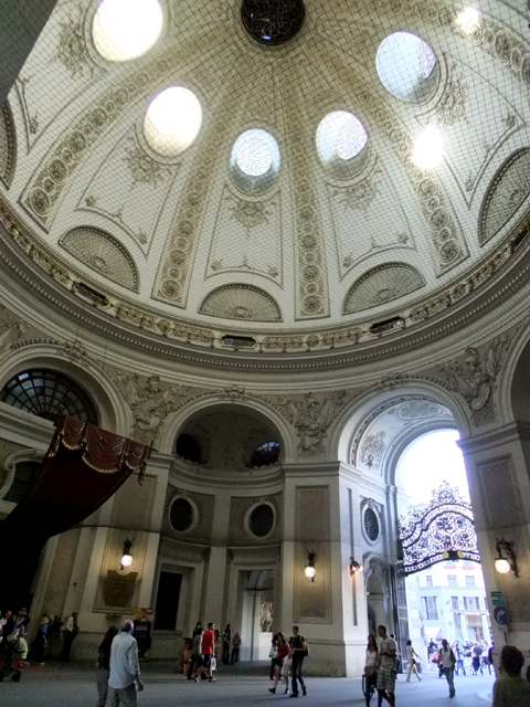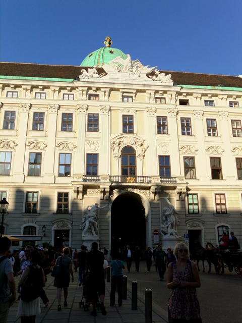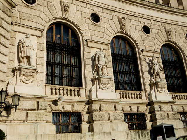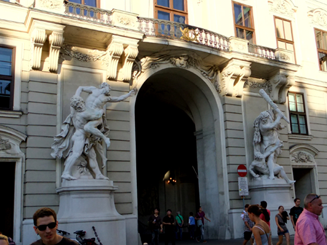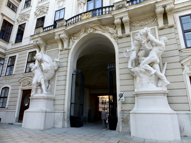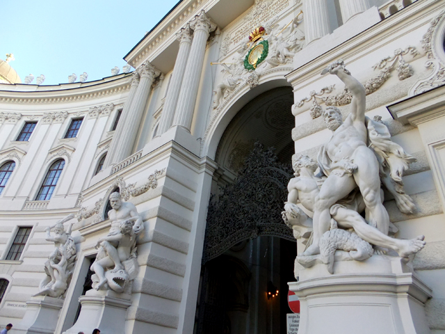 從這兒出去便是市區街巷了,很訝異霍夫堡竟非以深宮內院藏於園林,而是與民眾如此親近。不過相對於英雄廣場那兒的平實牆門,這側的米歇爾門就真的貼合皇家風範,它似新宮那樣切作凹弧面,並有著綴金銅綠拱頂,山牆以站立坐倚人像自然帶出曲邊,門柱則有海克利斯揮舞棒鎚,勇戰惡龍、撲殺怪獸。