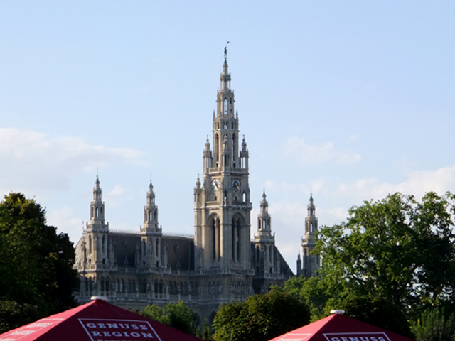儘管跟在貝爾維迪宮一樣,不知遇上啥活動,一堆白色帳篷跟擁擠人潮遮擋了那兒的人民公園,不過在視線的遠方,能見到環城大道邊的市政廳於藍天中勾出輪廓,細碎尖拱尖錐精緻撐起中高側低的五座高塔,潔白身姿帶著纖弱的美感,想進前端看,但很黯然地,現實卻令我只能在遠方與其遙遙對望。