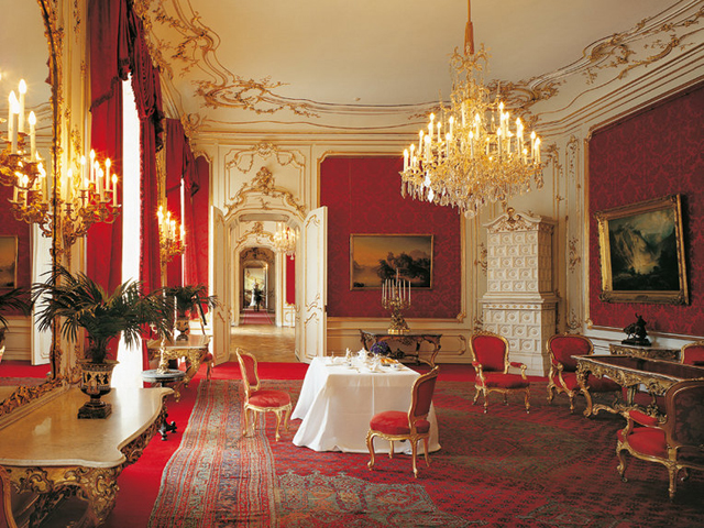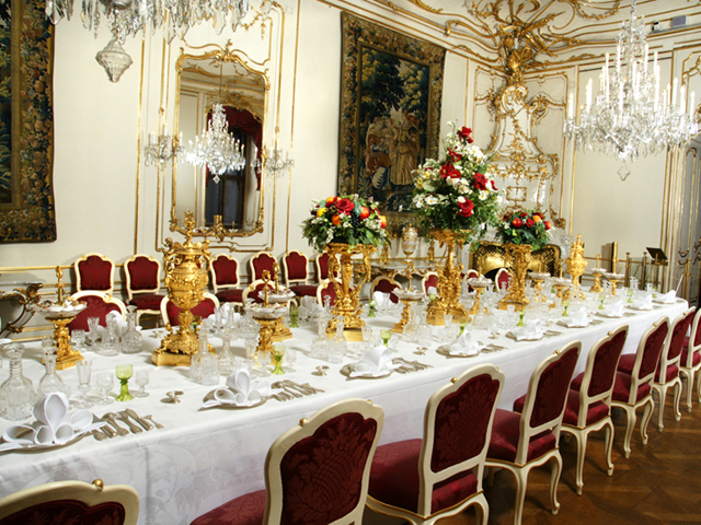 而從官網資料查看,宮殿廳室倒無特別豪奢,大多僅在雪白牆面綴上洛可可風格的焰舌花藤金框,有的會加襯勾纏隱紋的暗紅壁紙,讓色調多些深沉霸氣。不過一併展出的皇家食器倒是金光燦然,整排繁複雕琢的瓶盤相當炫目。
