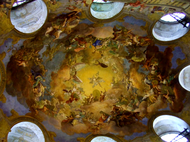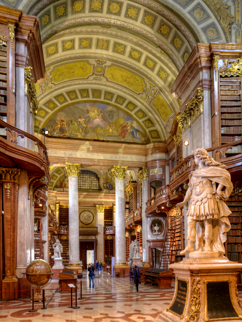 假使再往內深入,便可見到皇家圖書館的典藏書籍。切割作彎流曲面的木色書櫃於挑高空間內堆疊,雕像與綴金紋刻適度地在帶有氣質的氛圍中,點出屬於王室的奢華,如此於繽紛拱頂壁畫下閱覽精美的手工古籍,很令人神往。