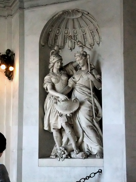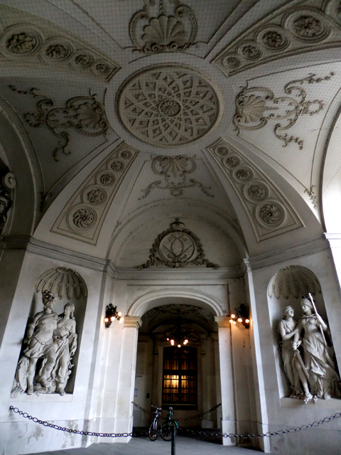 但這些景象只能倚靠滑鼠遊歷,我們這餐前市區匆匆導覽團,被逼著目不斜視、清心寡慾,直接從舊首相廳拱門穿出了。門廊的八角空間很意外地有著精緻雕琢,拱頂的淡雅刻紋下,對稱環圍著四組人像,他們秀美面目、穿著盔袍,有點雌雄莫辨。再過去,相接的圓廳外闊挑高,窗拱間隙以斧鉞旗幟為主題,織連出複雜刻繪,攜著團花帶飾的穹頂灑下天光,將這座對外的米歇爾門添上尊榮氣度。