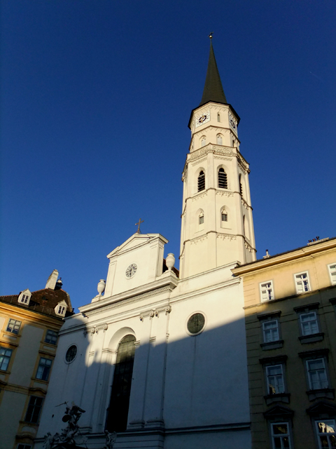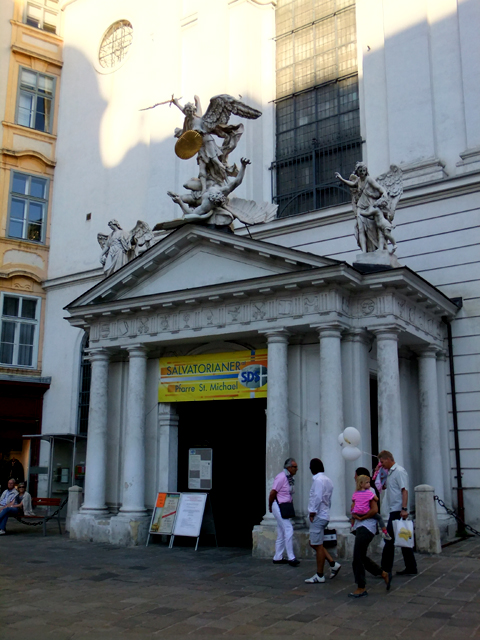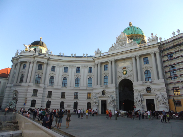 面對此樓順時針往右看,廣場這側的建築稱為瑞士宮,有很醒目的紅黑相間拱門,上面加綴金色文字與徽印。會得這樣稱呼,是因那時王室都喜僱用忠誠度極高的瑞士人作門衛。若自此處進去,能參觀包括冠冕、禮服、儀杖等各樣精心打造的皇室珍寶,運氣好的話,還會遇上知名的維也納合唱團在禮拜堂內練習。