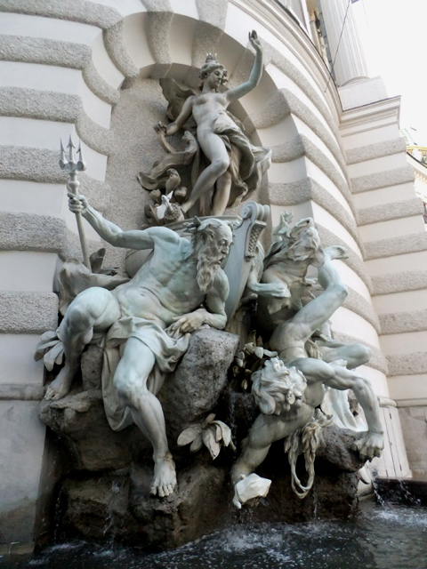 不知為何,總覺巨漢們那粗豪面目帶著些許憨蠢,相較之下,邊側兩座便靈慧許多,儘管其一被維修鷹架遮掩,餘下的依舊展露它豐沛的線條流動。那似是象徵海權的女神,站在礁岩之頂,秀美中帶著威儀,一翻掌便擊退撲爬而上的海獸敵軍。翻倒士兵的駭懼神情,旁侍老者的鬆頹肌理,都呈現了整個作品的細緻。