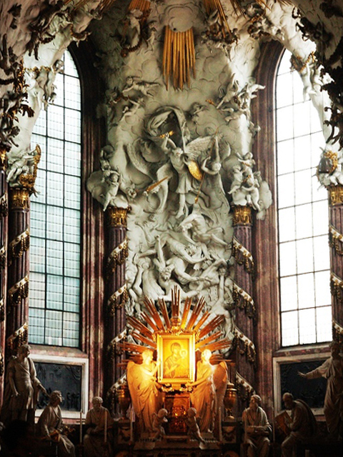 廣場對邊是聖米歇爾教堂,以雪白高塔指天,跟皇宮相較,它那隱晦的邊框飾刻便顯得低調。不過門楣上的大天使聖米歇爾腳踩敵寇、舞劍揮盾,飛揚翅翼依舊延伸了廣場的瑰麗景緻。