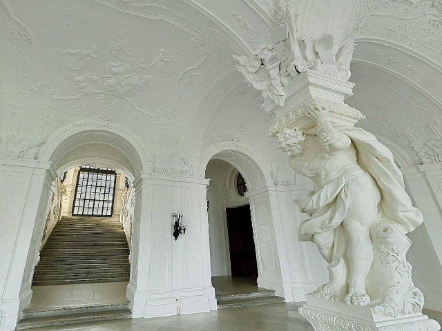 可是我卻無法隨這曲流揚擺,僅能在館外暗自揣度真跡,時間不允我內探,一扇門扉便這麼硬生生斷絕相遇緣份。此外,除了各樣展品,無緣的也包括宮內那些符合親王權勢的雕琢。瀏覽官網資料,門廳是以黑鐵燈座襯托出的雪白空間,壁面妝點著淺浮雕。主梯往下通往對面門廊,那兒有四根化為力士支天的雕柱,鼓脹肌肉、粗豪面鬚,與周遭的細緻紋刻形成強烈對比。