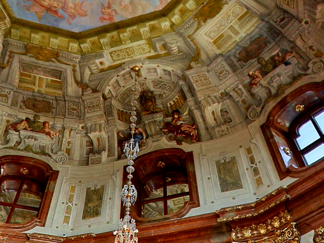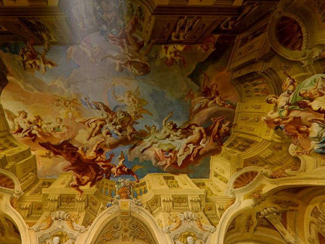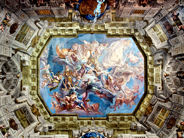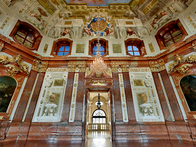 若登階而上,是大理石廳,紅褐柱框將廳間挑高,中段用燦金龕頂與柱頭彰顯貴氣,壁面則以立體繪法填補,越是往上越是繁複,虛窗假欄不斷堆砌,黃白柱礎間坐臥男女,弧拱交會的天頂則為漂浮雲端的猶根親王,被眾多美德化身的神祇團繞。