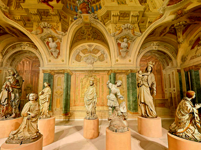 除了這些,還有以設計師為名的Carlone廳,雖同樣以繪彩取代實際刻鑿,但相比大理石廳似乎娟秀許多,淡粉的用色細緻勾出曲弧柱欄,於是黎明女神飛舞著,天使們揚擺巾袍,歡快騰遊。展廳裡擺設的人物雕像,似乎也鮮活起來,抬首望著頭頂繽紛。