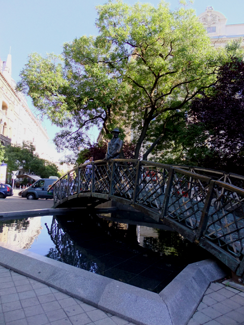 途中有個不規則水池,小橋彎彎跨過,在綠蔭下帶了點中國園林的詩意。上面還刻意雕出位老者,倚著橋欄轉頭遠望,我走至他身旁,跟著靜看街景,似乎城市也能是山林,若有幾聲鳥鳴便見清新悠遠。
