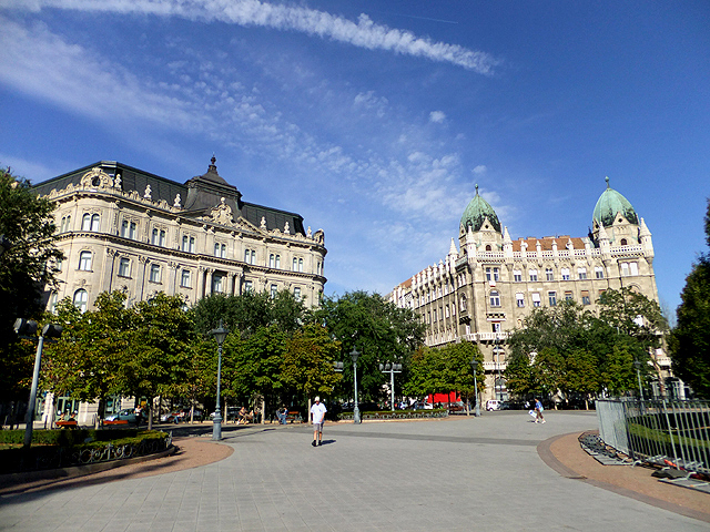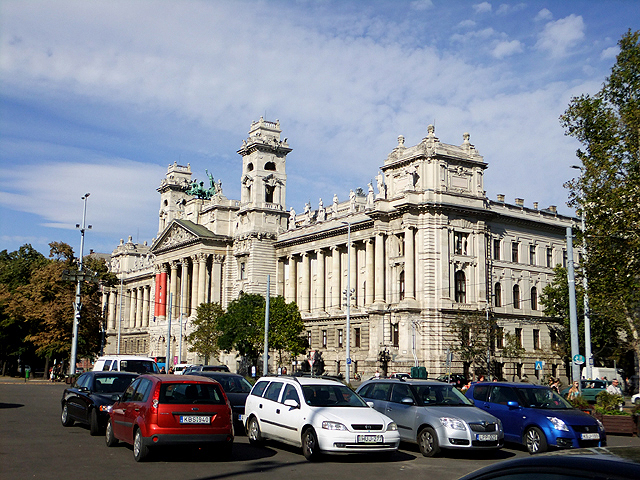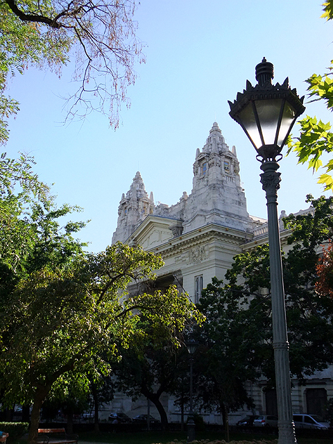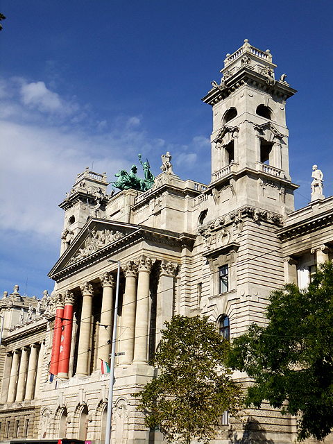 隔著正門這處的廣場,尚有間醒目大樓與國會相對。方正厚實的建築以希臘神廟式的古典風格切出線條,有帶浮雕的三角門楣及成列柱廊,支柱穿透頂簷化作一個個人像,而在正中兩座方塔間,則飛馳著青銅馬車,承載高持火炬的女神。這是匈牙利的最高法院,但現已改建為民族博物館,據說裏面展出許多民族衣裳與風俗相關物事。我走至門廳望了望,裏面光線晦暗,不見人跡,也無管理員招呼,看不出是否開放,但亦可能真的冷門至無人探訪。