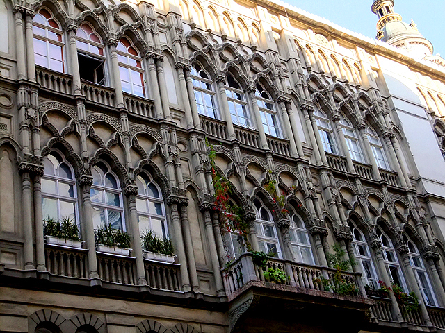 教堂位置在東南,雖為折返方向,但還是得往外繞路。我隨意挑著街巷穿拐,跟布拉格相比,遊人少了許多,但走來也因此清靜,然眼前建築並不遜色,每步踏出皆為風景。也許是窗臺如扇貝外探,然後在柱框刻鑿出流雲紋路。窗廊可以細緻如疊瓣、如重浪,帶著綴邊以波弧交會,幾縷攀纏花藤便顯繽紛。亦能壯偉得撐起拱頂,雕切成厚實塔尖,襯著碧綠林葉,便似險峻山巒。