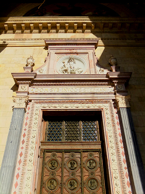 雖走過歷史風霜的斑駁教堂有著陳釀的豐厚味道,讓人藉由傷痕與過往對談,但不可諱言地,年輕的聖史蒂芬教堂卻自能以完整無暇的光華,讓人癡癡凝望。走至門廊,頂上拱弧便有細膩刻花與綴金鑲板拼組,在雕出十二使徒頭像的門板上,另有聖史蒂芬持著法器,威嚴俯瞰眾人。而當從偏門踏入,暗紅雲紋的大理石帶著燦金柱頭,支撐起被側窗陽光輝亮的天頂鑲畫。