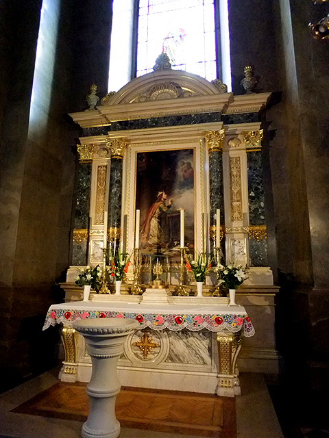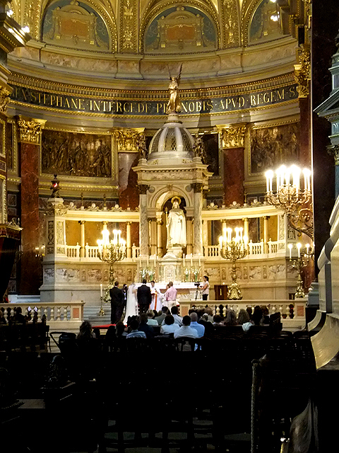 可是很奇異地,側廊祭壇幾無點燈,凸顯日照未及之處的沉暗,反倒一群人擠在通往中廊的轉角,顧探堂中透出的輝華。走了過去,才發現原來我遇上一場婚禮,主祭壇那兒被燭火映照得燦亮,遠遠可見新人交握著手聆聽禱詞。壇座呈弧形,像是個具體而微的敞廊般,有支柱及長帶浮凸刻繪,而在綴上天使的拱頂龕室裡,手持儀杖的是聖史蒂芬,正於皎潔光芒中見證這場典禮。