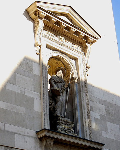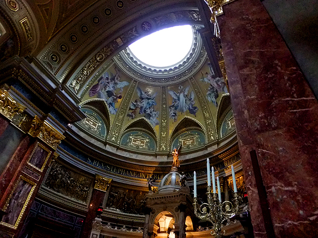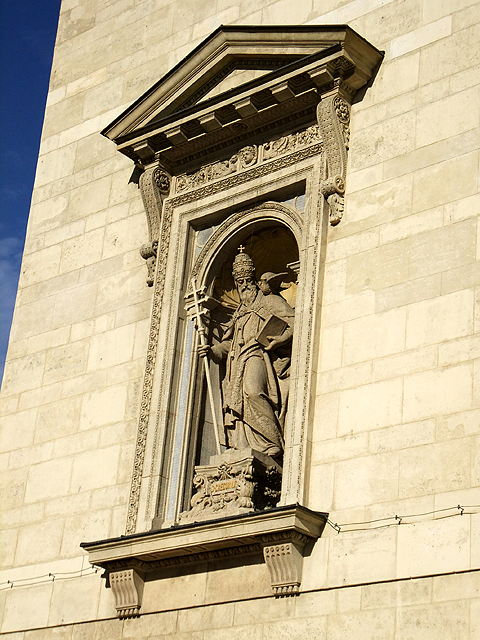 晃過幾個街區,終於我來到聖史蒂芬教堂。它揉雜著新文藝復興與新古典風格,工整且壯偉地抬首傲立。底牆的線條很簡潔,僅切出幾個窗臺與人像龕室,但氣勢隨著高度漸次堆疊,柱頭的繁複雕花、刻繪聖母子的希臘神廟式山形牆、中央拱頂與兩側鐘塔如三叉戟,攜著墨綠鑲金的採光罩,以浮凸線條探入藍天白雲。