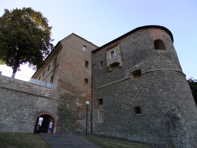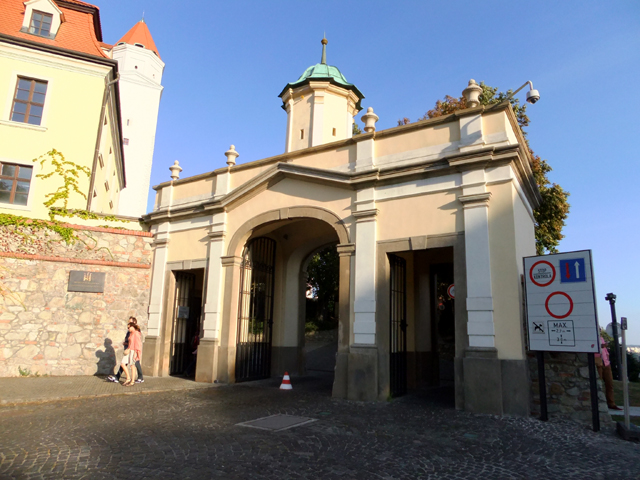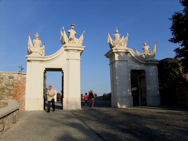 在望台附近左拐,便是此處古城。隨時年更迭,它的外觀風格曾從哥德、文藝復興再轉至巴洛克,但十九世紀初又遭摧毀,近些年才依原本架構重建。如今於斑灰城牆後,是它四方形的雪白身影,頂著橙簷,四角聳立尖塔,彷若倒置方桌。從外門行入,幽靜的林蔭步道引領大夥往前,但沒多遠又有道內牆,猜測是當初為了防禦工事,才設計得如此盤繞疊層。其牆門柱頂裝飾著雕像,略帶簡約的線條,以盔甲槍砲旗幟凝造威武氣勢。