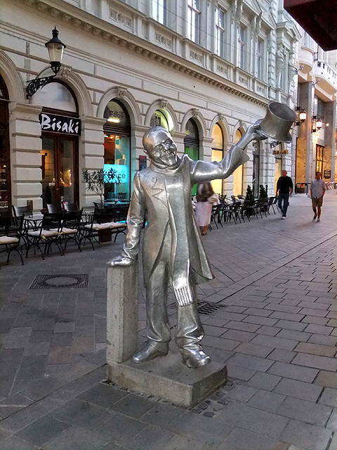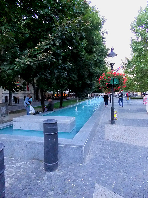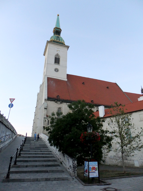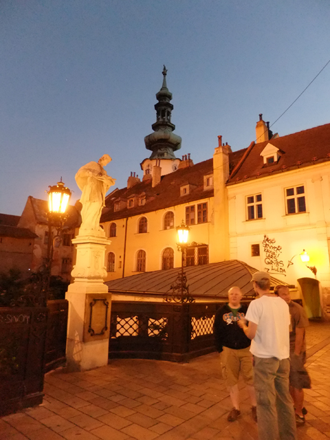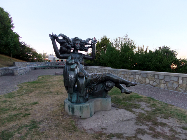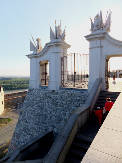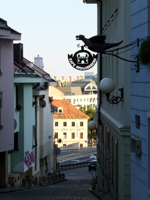 而山丘另側像個公園讓人於綠樹間閒逛而下,路上能見著厚重高牆與防禦城塔,還有些近代添加上的雕塑。有一尊女子被眾多烏鴉環繞,赤紅眼、飛亂髮,彷若梅杜莎或某作法中魔女,不知雕得是何人。遠處自然還有輕蕩而過的多瑙河,而此時望去的角度多了些山丘下的屋舍,粉牆紅瓦,還有座教堂鐘塔,頂著銳利塔尖,突入天際。