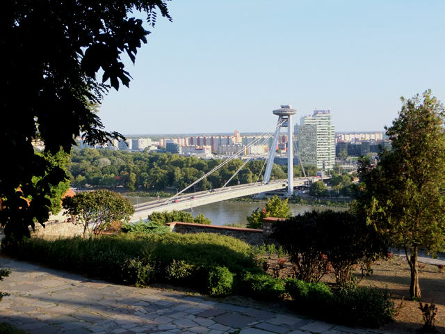 下車地方是個小山丘,順拼貼石板路前行,一處寬廣望台將城區景色開展。名聞遐邇的多瑙河筆直在兩排林樹間劃過,儘管圓舞曲「藍色多瑙河」描述的非其色彩,然此時望去,倒映晴空的大河的的確確透著湛藍,在風拂間推送涼爽氣息。