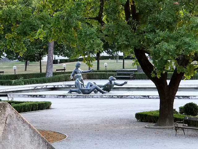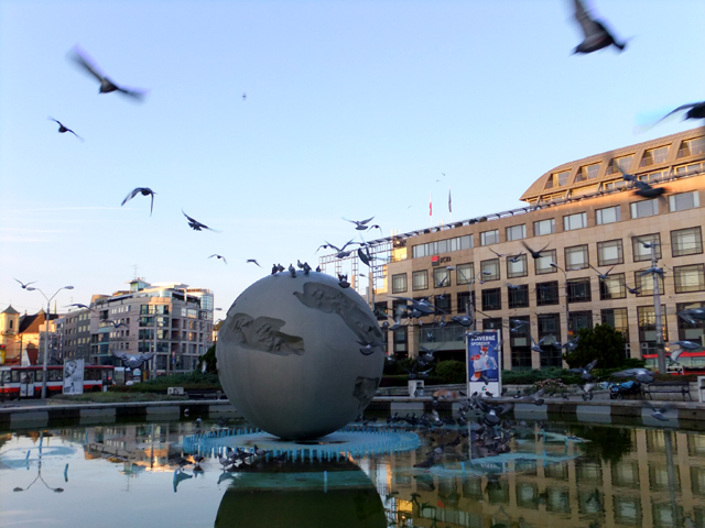 天明,把握早餐前的空閒,我往街區的另個方向逛去。根據昨日領隊大概的指點,沒多久我找到了總統府。廣場有個大水池,清晨時間噴泉自然是歇息的,當中球形雕塑挖出不規則溝槽疤痕,不像地球大陸,無法猜測其隱喻,難道會是意指近代波瀾所留之創傷?雖然水泉靜止,但周遭卻停滿巨群鴿子,一緩步踏近,便振起滿空灰翼,數量多到令人害怕牠們向我飛擊,或是落下轟炸贈禮。