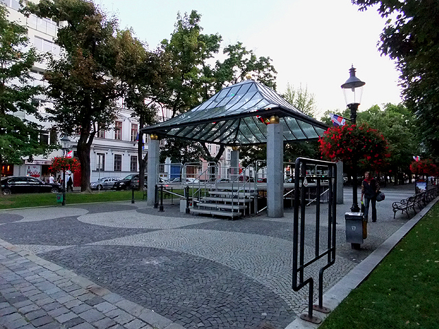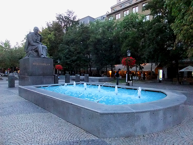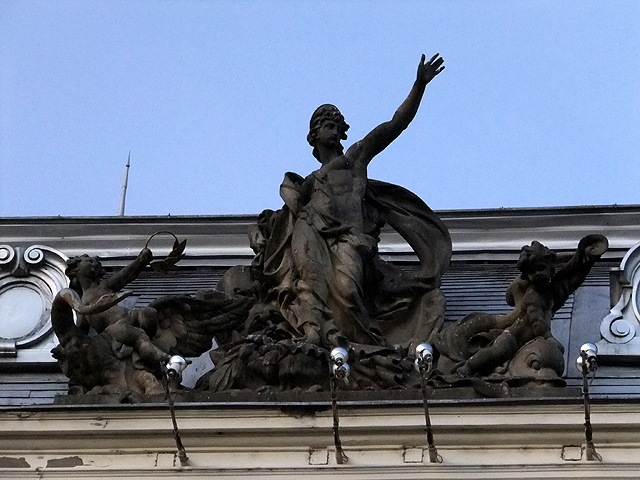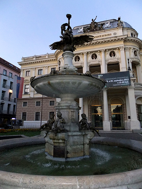 而廣場末端是國家劇院,門口有噴泉,泉座刻出孩童騎乘展翅飛鷹。立面則帶弧角,長拱頂與柱廊間為一個個人物胸像,根據一些劇院的傳統,猜測應是著名音樂家吧。此外,刷白建築頂梢綴上袍巾飛揚的天使,讓其似乎攜著宛若音符的躍動,儘管傍晚天色已趨灰暗,依舊有種光采令我駐足端望。