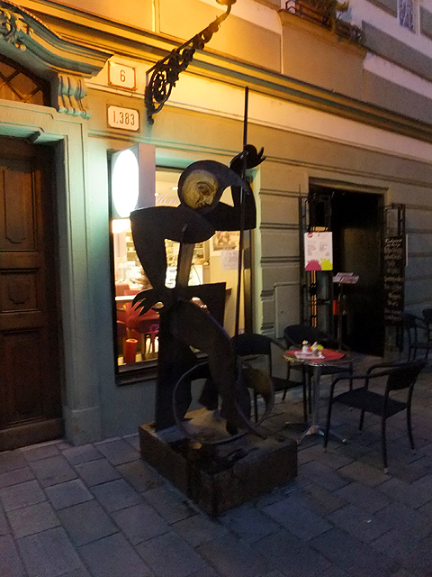 從這兒轉入窄巷,路幅雖然狹小,卻是歡鬧異常,一家家餐館點起招引人客的燈火,有的擺出中世紀甲冑,彰顯其店的舊時代風味,有的置放別上月牙側臉的人形拼板,似乎裏面便有奇幻詭譎戲宴。甚或,服務生與廚師乾脆走至門口吆喝拉客,熱情萬分。