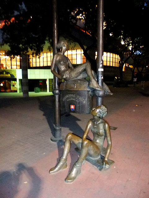 我們在街頭穿繞,往不遠處的旅館前行,步道上有組雕塑作品,兩個纖瘦身影一上一下坐著,一人抬首癡癡凝望,似乎有著深情,另一人卻心不在焉看向遠方,彷彿企求的是隱匿於迷茫夜晚的微小光點,曾經燦亮,卻已逸去不再屬於自己。